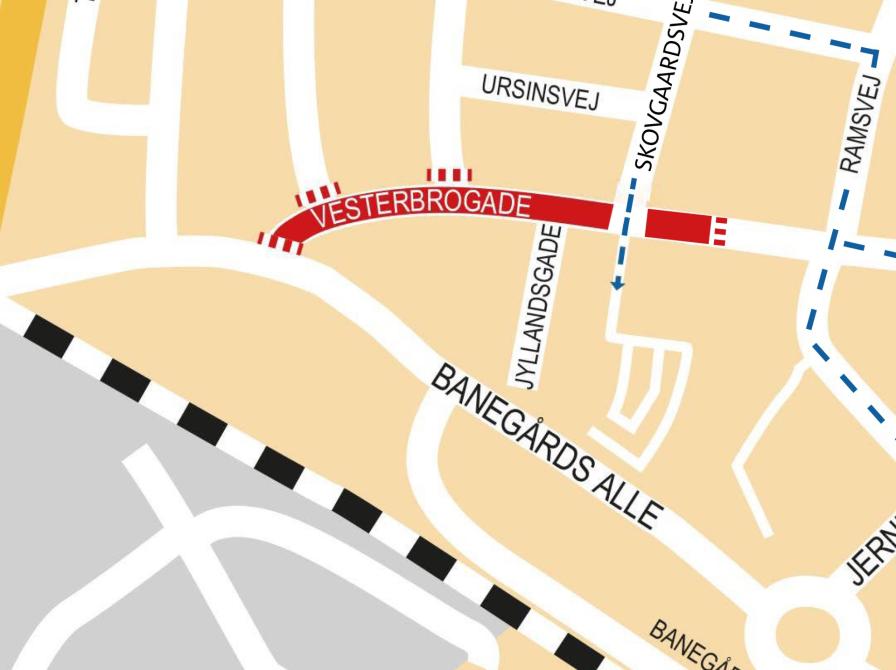 På grund af omfattende fjernvarme-, kloak- og belægningsarbejder, spærres Vesterbrogade på stykket mellem Skovgaardsvej og Banegaards Alle fra mandag den 15. september og resten af året.