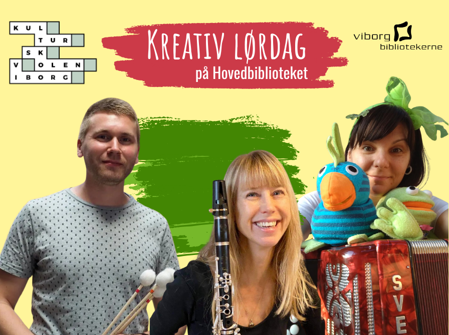 Kulturskolen Viborg ”overtager” Børnebiblioteket på Vesterbrogade fire lørdage i træk, hvor du kan deltage i kreative aktiviteter og workshops med sang og musik, teater og scenekunst og billedkunst og design. Vi starter med musik for børn med Pavlina, Mette og Jonas.